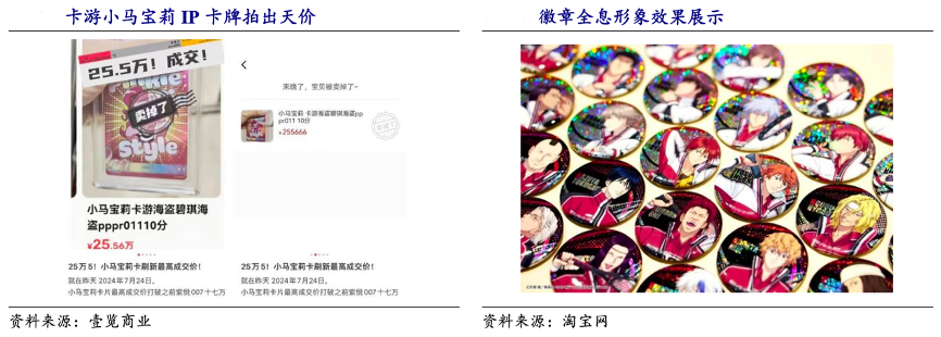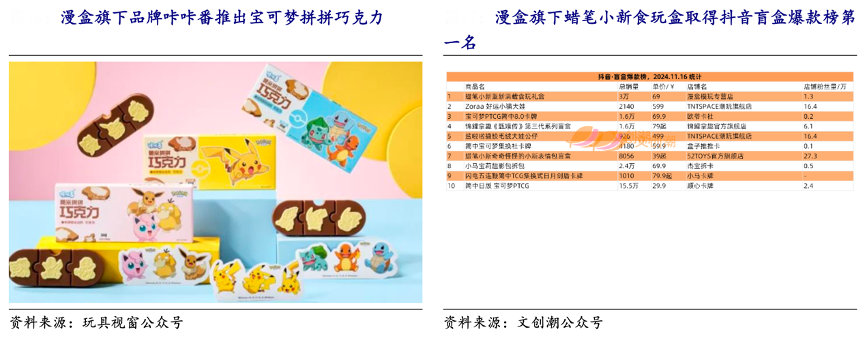 经典案例:根据玩具视窗公众号、文创潮公众号、开源证券研究所等综合资讯表明,食玩品牌 ACGBOX 漫盒在 2023 年同比取得了近 3 倍业绩的增长。漫盒产品所覆盖的渠道有便利店、Ole'精品超市、盒马鲜生等,线上销售有 B 站会员购、淘宝、天猫等渠道。