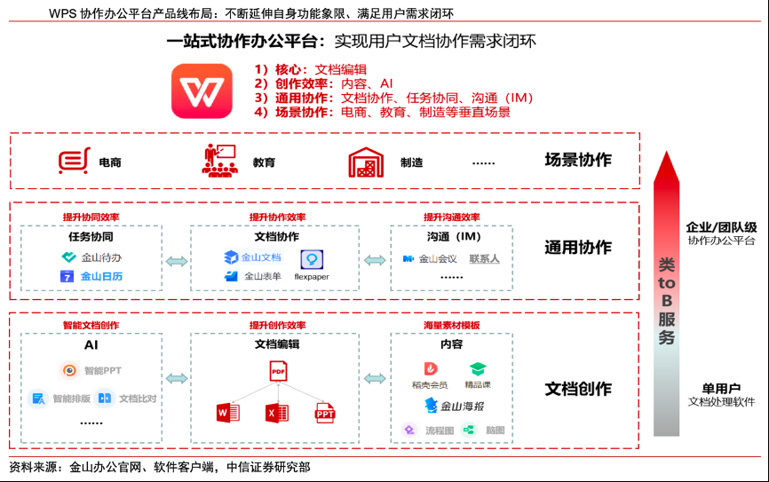 伴随信创体系持续推进,WPS 积极参与国产流式文件标准UOF2.0 建设,协助建立我国自己的文档标准体系,有望进一步发挥国产办公软件的产品优势;在生态方面,WPS 也通过联合并赋能上下游合作伙伴的方式,建设中国办公软件生态。