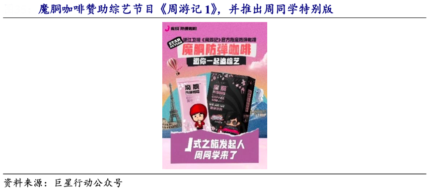 经典案例:根据巨星行动公众号、开源证券研究所等综合资讯表明,巨星传奇公司新零售产品线丰富,截至 2022 年,周同学特别版魔胴咖啡对公司收入贡献近 25%,占魔胴咖啡总销售 额的 57%,明星 IP 联名助销效果显著。根据灼识咨询,2023 年魔胴咖啡销量、销 售额均位列中国防弹饮料赛道第一。