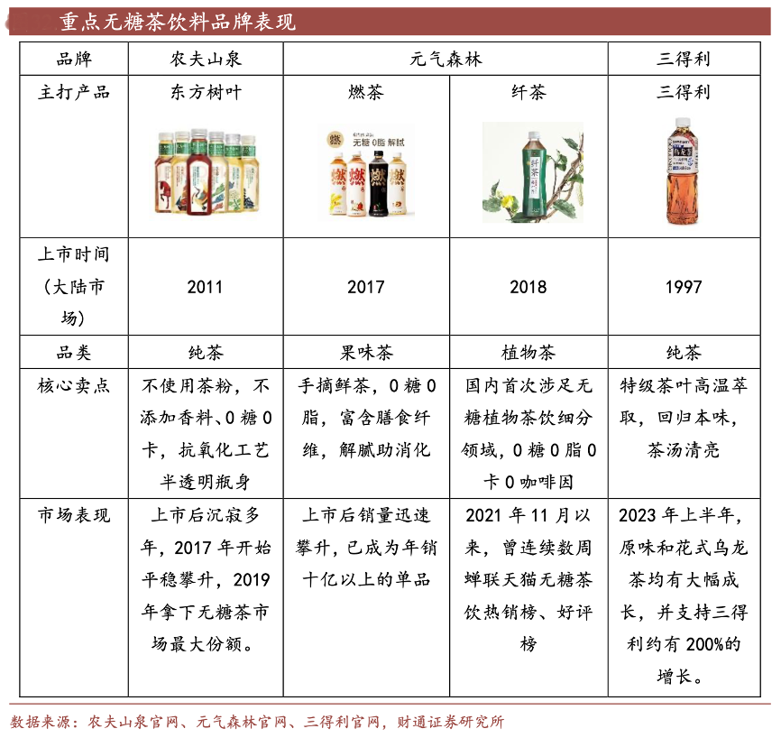 经典案例:根据农夫山泉官网、元气森林官网、三得利官网、财通证券研究所等综合资讯表明,如今国内无糖茶市场格局,几乎已经由东方树叶作为老牌传统无糖茶产品“领跑市场”,以三得利为代表的日产无糖茶饮“持续发力”,新锐无糖茶饮品牌“崭露头角”构成。截至 2023 年 11 月,以电商平台京东为例,在无糖茶饮料品牌排行榜中,排在前三位的品牌是农夫山泉、三得利以及果子熟了,作为新消费优等生的元气森林排在第七位。
