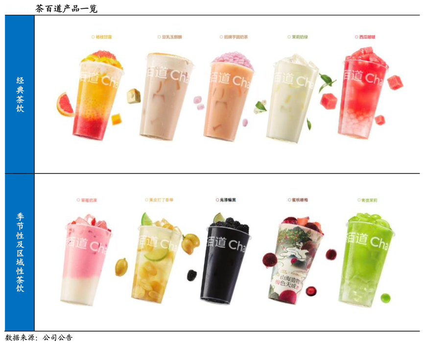 经典案例:根据招股书、咖门、国泰君安证券研究等综合资讯表明,茶百道公司持续 对消费者口味喜好的变化趋势进行调研与预判,通常每隔几个月即上新季节限定款或区域限定款产品的方式持续为消费者带来新颖、惊喜的茶饮体验。2023 年,茶百道开发出约 250 多款产品,并推出了 48 款新品,升级了 13 款产品,饱受消费者好评。