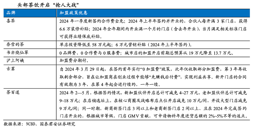 经典案例:根据NCBD、国泰君安证券研究等综合资讯表明,2024年以来,头部连锁茶饮品牌通过 调整加盟政策,进一步降低加盟门槛,开启“抢人大战”。头部品牌发力争夺市场份额,有望凭借规模优势、供应链能力以及运营能力加速尾部 独立茶饮店出清。