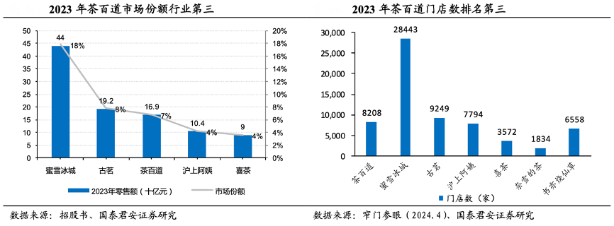 经典案例:根据招股书、窄门参眼(2024.4)、国泰君安证券研究等综合资讯表明,截至 2023 年,茶百道是全国门店 数排名第三的茶饮企业,仅次于蜜雪冰城和古茗。按零售额计,茶百道也是全国零售额排名第三的茶饮企业,市场份额约为 7%。头部茶饮连锁 企业中,除了蜜雪冰城定位平价市场,其余品牌包括茶百道、古茗、沪 上阿姨等,大多定位 8-20 元中端价格带。