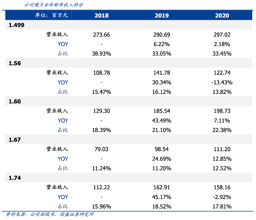 经典案例:根据公司招股书、国盛证券研究所等综合资讯表明,耐特光学高折射率镜片占比稳步提升,高端化趋势明确。公司镜片覆盖 1.499-1.74 折射率范围,2020年 1.499/1.56/1.60/1.67/1.74 折射率镜片收入占比分别为 33.5%/13.8%/22.4%/12.5%/17.8% , 2018-2020 年 CAGR 分 别 为 4.2%/6.2%/24.0%/18.6%/18.7%,高折射率镜片增速快于整体。