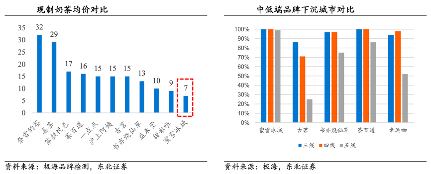 经典案例:根据极海品牌检测、东北证券等综合资讯表明,对比其他连锁现制茶饮品牌,蜜雪冰城主打极致性价比,几乎没有竞品客单价低于蜜雪冰城。公司以优质平价策略不仅收割了同类型竞品的份额,同时承接了包装茶饮市场中消费升级的需求,因此,公司定位的目标客群广袤,受众市场优于高端茶饮玩家,且在品牌定位上较其他中端竞品更清晰。
