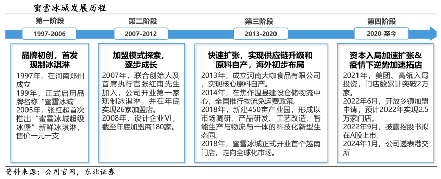 经典案例:根据公司官网、东北证券等综合资讯表明,2017年,蜜雪冰城公司推出现磨咖啡品牌“幸运咖”;2020 年门店数破万家,2021 年美团、高领等资本入局,门店数突破 2 万家,同年公司最大的生产基地于河南投入运营。
