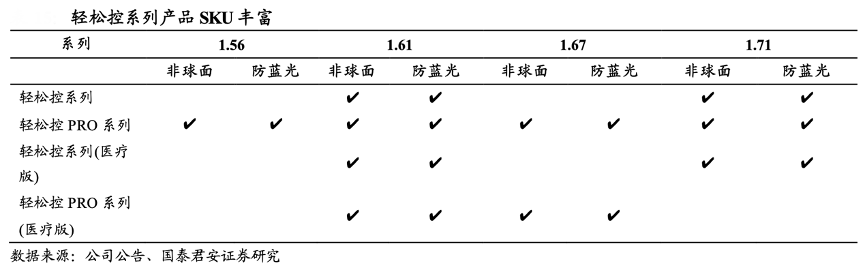经典案例:根据公司公告、国泰君安证券研究等综合资讯表明,明月镜片公司截至目前零售渠道共有 12 个 SKU,医疗渠道共有 8 个 SKU,公司在近视管理镜片品类已有合计 20 个 SKU 同时在售,在产品线丰富度方面继续保持明显领先。