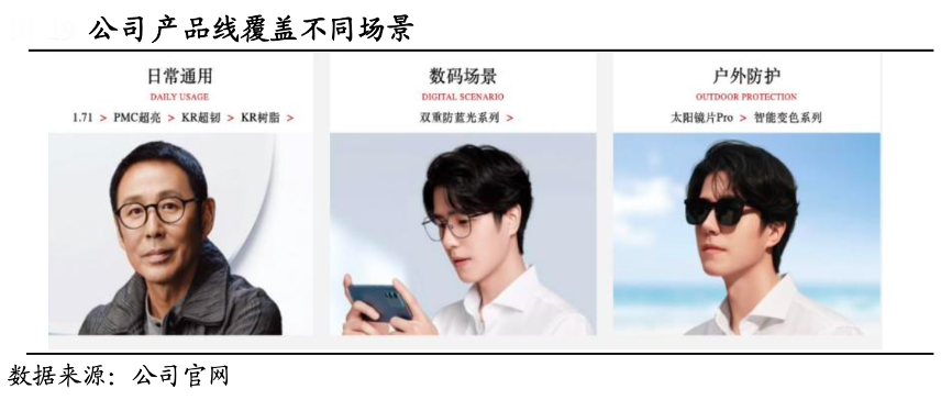 经典案例:根据公司官网、国泰君安证券研究等综合资讯表明,明月镜片公司自主研发设计镜片光学结构、膜层结构,产品系列覆盖满足日常生活需求的通用型镜片、针对不同人群及多元使用场景的功能性镜片,如长时间使用电子屏幕人群可以选择明月独家双重防蓝光系列、喜欢透光性更强“水晶”般透亮不反光的可以选择 PMC 超亮系列,追求轻薄镜片体验人群可选择折射率 1.71 系列以及适合户外防护的近视太阳镜片 Pro 系列,还有 KR 超韧、智能变色、渐进多焦点等品类的镜片。