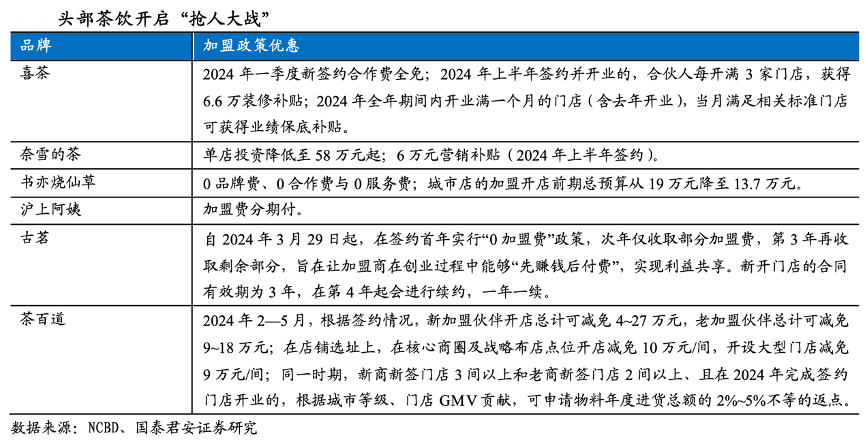 经典案例:根据NCBD、国泰君安证券研究等综合资讯表明,2024年以来,头部连锁茶饮品牌通过调整加盟政策,进一步降低加盟门槛,开启“抢人大战”。头部品牌发力争夺市场份额,有望凭借规模优势、供应链能力以及运营能力加速尾部 独立茶饮店出清。