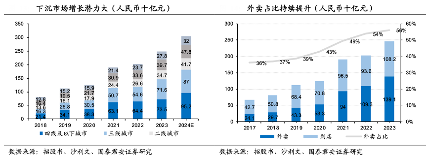 经典案例:根据招股书、沙利文、国泰君安证券研究等综合资讯表明,随着外卖平台和应用程序的普及,尤其年轻人生活方式和用餐偏好的改变,茶饮外卖渗透率持续提升。国内现制茶饮店市场通过外卖实现的零售额 已由 2018 年的人民币 297 亿元增至 2023 年的人民币 1391 亿元,年复合增长率为 36.2%;2023 年,现制茶饮行业外卖渗透率达到 56.3%。