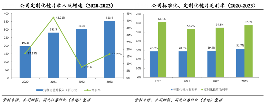 经典案例:根据公司财报、国元证券经纪(香港)等综合资讯表明,康耐特光学公司的定制化镜片是依据消费者的不同要求而为“量身定制”的产品。以公司为高度近视人群定制的帽仔片产品为例,其采用缩小镜片直径原理,在保证屈光度的前提下,最大可能的减小了镜片的厚度和重量。2023 年,公司定制化镜片收入为 3.54 亿元,同比增长 16.3%,占收入比例约为 20.1%,公司定制化镜片收入占比逐步提升。