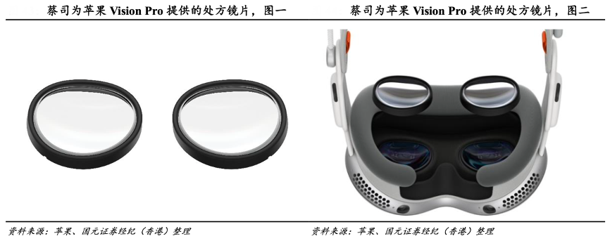 经典案例:根据苹果、国元证券经纪(香港)等综合资讯表明,2023 年 2 月,苹果混合现实(MR)设备于美国开始发售,售价为 3499 美元。除了基础产品外,本次苹果选择与蔡司合作,为 Vision Pro 提供专用的处方镜片,用户在购买产品时可以直接搭配购买光学矫正镜片。根据了解的信息,这些蔡司镜片有与 Vision Pro 有配对的个人代码,以作为防伪保障,用户在完成配对后通 过磁吸方式固定在 MR 设备上。