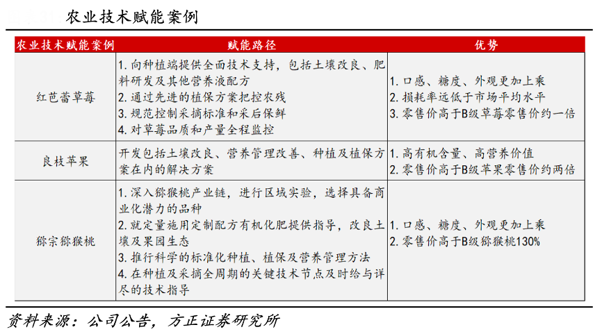 经典案例:根据公司公告、方正证券研究所等综合资讯表明,百果园通过向合作的种植基地推广种植理念和种植与采后技术,帮助种植基地培育优质果品,提升产量。