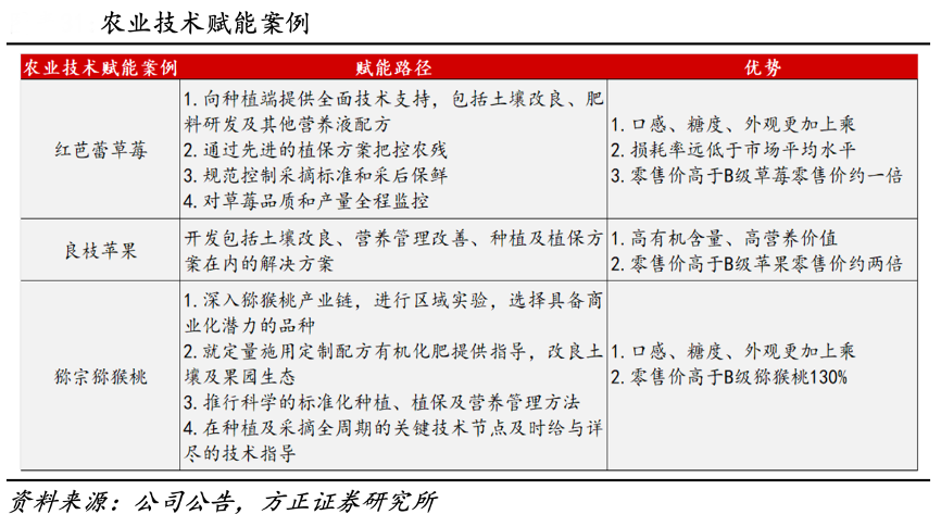 经典案例:根据公司公告、方正证券研究所等综合资讯表明,百果园通过向合作的种植基地推广种植理念和种植与采后技术,帮助种植基地培育优质果品,提升产量。