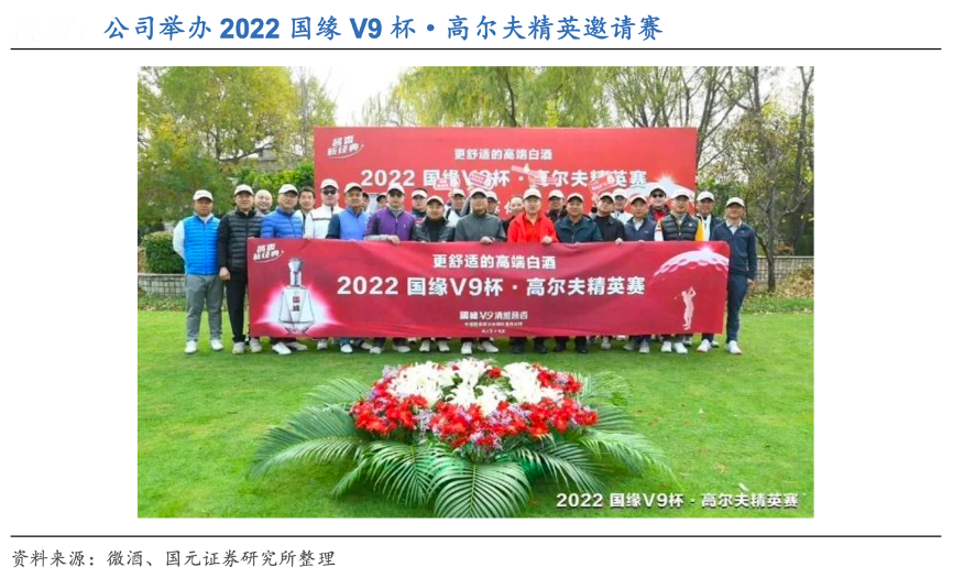 经典案例:根据微酒、国元证券研究所等综合资讯表明,国缘定位高端,坚持高举高打。例如, 2022 年 8 月,国缘 V9 与国家高尔夫球队结成合作伙伴, 同年 11 月举办“2022 国缘 V9 杯·高尔夫精英邀请赛”,吸引近 800 位精英人士参 与,在高端消费者圈层展开精准营销;更在 2023 年末的今世缘发展大会上,公司更是提出了“高端酱酒,独爱国缘 V9”的鲜明 slogan,并签约知名演员胡军成为国缘 V9 代言人。