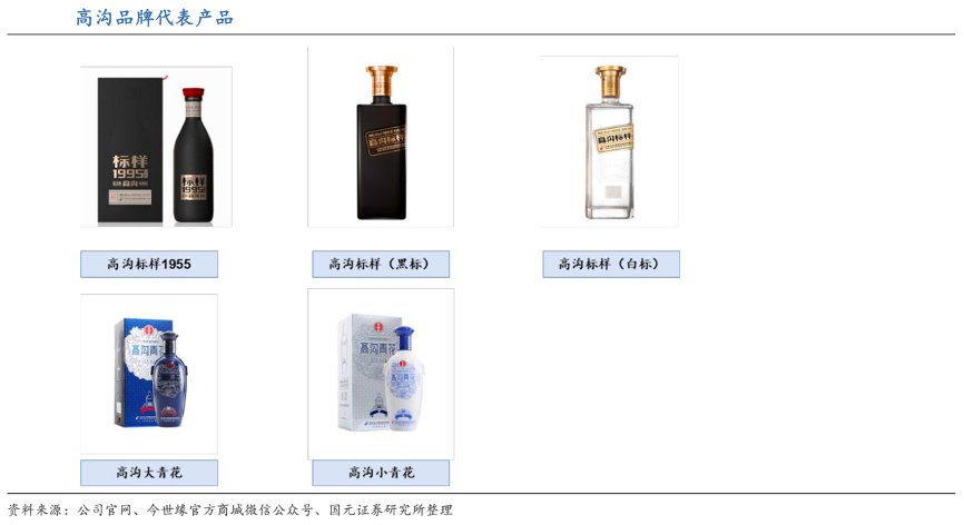 经典案例:根据公司官网、今世缘官方商城微信公众号、国元证券研究所等综合资讯表明,高沟品牌2022年品牌重塑后,以新品标样开启新征程。公司 2022 年 8 月推出高沟标样 新品,定位黄淮名酒带高线光瓶典范,其中高沟标样 1955 是高端形象产品,黑标、白标为主销品,两者中又以黑标为先。