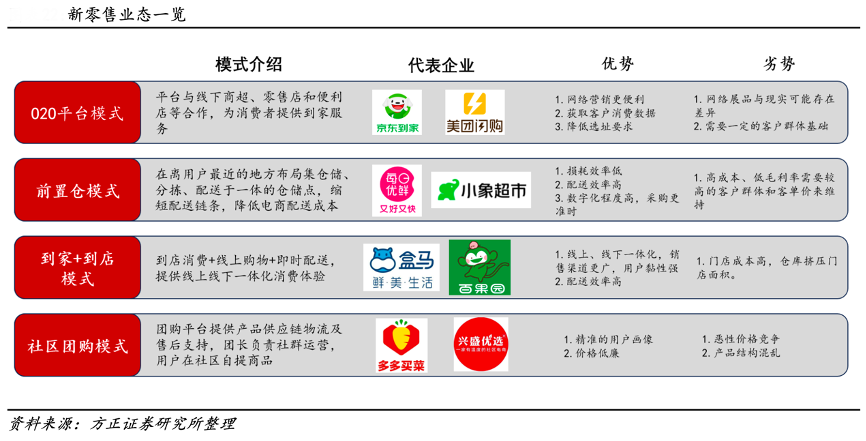 经典案例:根据方正证券研究所等综合资讯表明,随着新零售业态的不断发展,目前主要有以下四种新零售业态:以京东到家、美团闪购为代表的 O2O 平台模式,以每日优鲜、小象超市为代表的前置仓模式,以盒马生鲜和百果园为代表的到家+到店模式与以多多买菜和兴盛优选为代表的社区团购模式,四种模式各有优劣,目前零售行业呈现多种模式共存的现象。