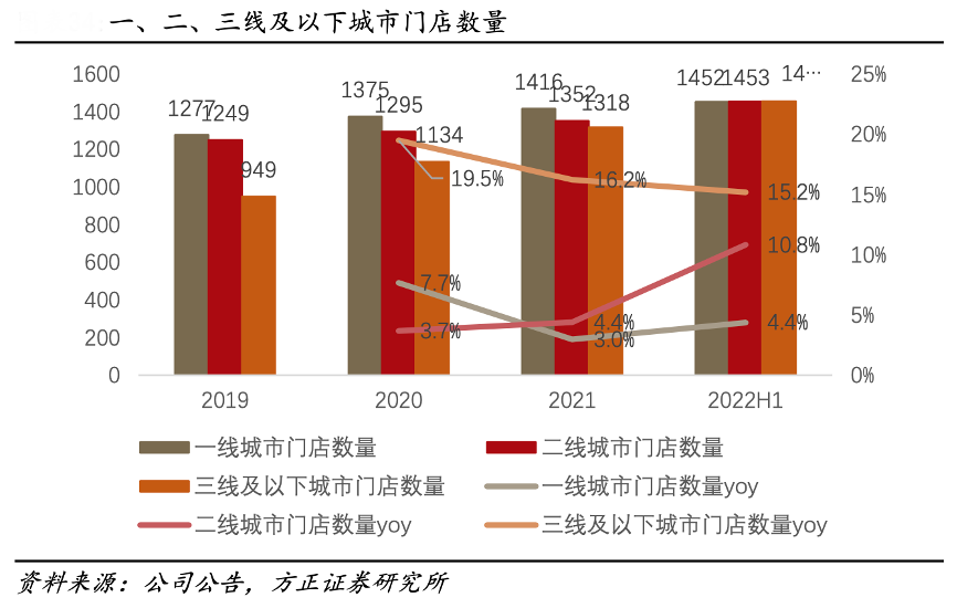 经典案例:根据公司公告、方正证券研究所等综合资讯表明,由于下沉市场中本地水果店的采购规模小,中间代理环节多,同等品质的水果在这里的加价率更高,因此百果园在下沉市场的发展空间广阔。三线及以下城市门店数量由 19 年的 949 家增长至 22 年 H1 的 1456 家,复合增速达 13%。