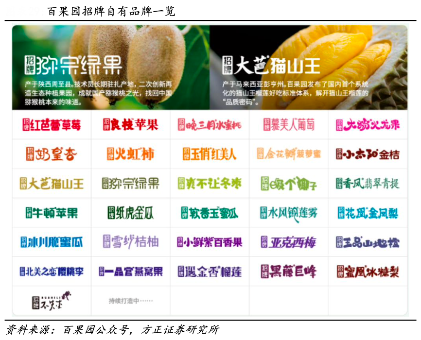 经典案例:根据百果园公众号、方正证券研究所等综合资讯表明,截止 2023H1,百果园公司共推出 35 个自有产品品 牌,零售额同比增长 27%。相比 2022 年同期,自有品牌的零售额占百果园门店零 售总额达到12%,2023 年提升至 14%。招牌果及自有品牌水果平均每月购买率一 般高于 B 级水果 50%。