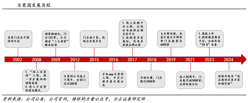经典案例:根据公司公告、公司官网、榜样的力量公众号、方正证券研究所等综合资讯表明,百果园业务多元化发展,品牌战略升级。2019 年发布“大生鲜” 战略, 2023 年公司于港股上市,并控股般果平台,全面布局“To B”业务。2024 年品牌战略升级为“高品质的水果专家和领导者”,计划十年内营收达到千亿级别。