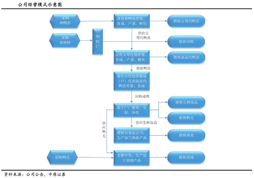 经典案例:根据公司公告、中原证券等综合资讯表明,华英农业在成鸭屠宰环节,其总部加工厂按照约定回购合作的养殖场(户)育成的合格商品成鸭, 经屠宰加工制成冻品及生鲜制品。冻品及生鲜制品一部分自用,做熟食生产原料;另一部分通过经销商或直接销往终端客户。