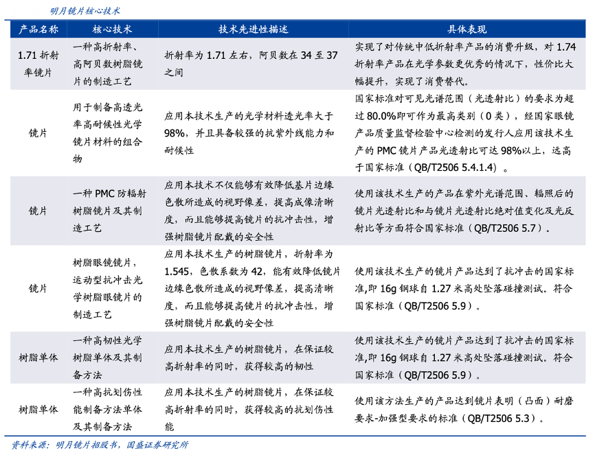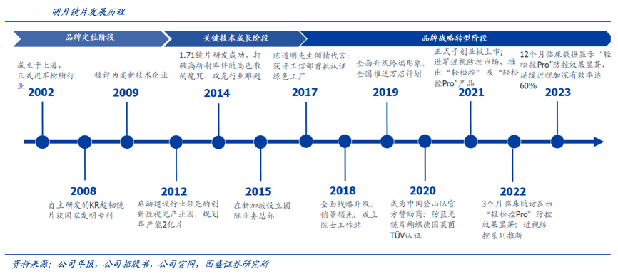经典案例:根据公司年报、公司招股书、公司官网、国盛证券研究所等综合资讯表明,明月镜片是专业从事镜片研发与生产的国内镜片行业领军者。公司业务主要涵盖树脂原料、树脂镜片、镜架及成镜等眼视光产品的研发、生产及销售。公司历经初创、技术突 破和品牌升级三个阶段,始终以研发为本,其原料、光学设计、实用功能和膜层等方面在国产品牌中占据优势,目前已成为国内领先的综合类眼镜镜片生产商。