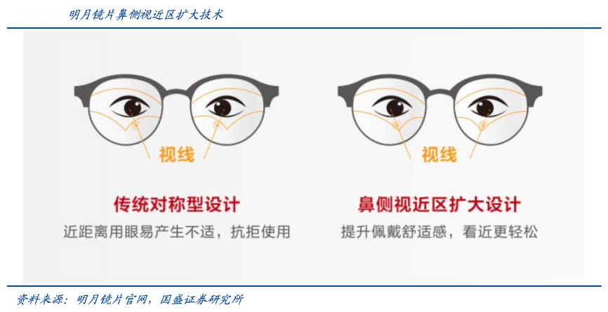 经典案例:根据明月镜片官网、国盛证券研究所等综合资讯表明,明月镜片公司产品形态多元、贴近中国人用眼习惯及需求,推出的“轻松控”近视 防控产品采用非对称的 Nasal Side 鼻侧近视区扩大设计,更加符合中国孩子“长时间近距离用眼”和“眼球内旋”的生理特点,提升佩戴舒适性、近视管理效果更佳。