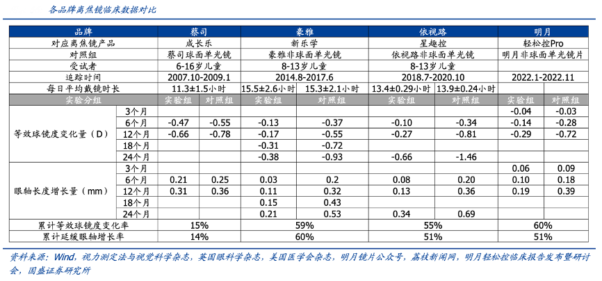 经典案例:根据wind、视力测定法与视觉科学杂志、英国眼科学杂志、美国医学会杂志、明月镜片公众号、荔枝新闻网、明月轻松控临床报告发布暨研讨会、国盛证券研究所等综合资讯表明,渠道方面,明月镜片公司80%线下终端门店铺设焦镜产品,此外专门组建团队开拓医疗渠道市场,截至 2022 年底医院类客户 125 家,预计持续贡献增量。专业性方面,公司在行业内率先以 3 个月为观察周期发布临床研究结果,高频率、精细化的数据跟踪发布充分彰显产品自信。