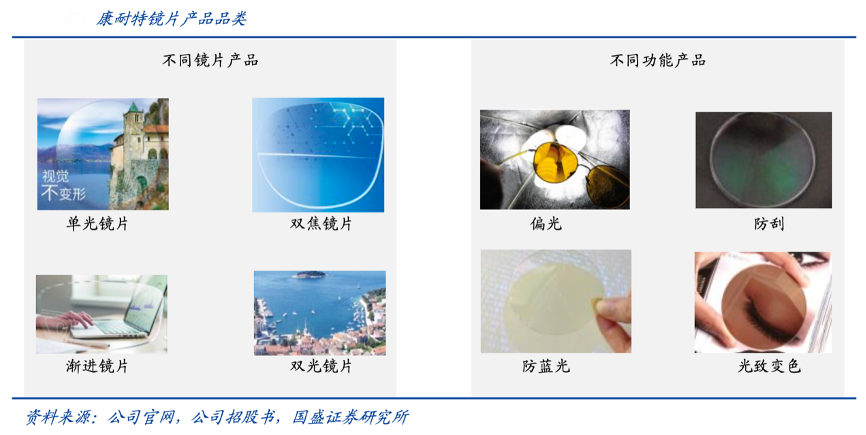 经典案例:根据公司官网、公司招股书、国盛证券研究所等综合资讯表明,康耐特产品矩阵丰富,定制化能力突出。自 2018 年日本开放专利以来,康耐特是目前唯一成功引进日本 1.74 折射率镜片生产技术并批量生产的公司。此 外,公司根据镜片设计,将产品分为平光镜片、单光镜片、多焦点镜片及渐进镜片,能够覆盖绝大多数标准镜片设计,SKU 超 600 万。