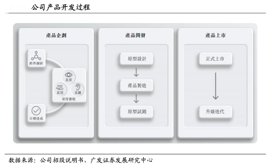 经典案例:根据公司招股说明书、广发证券发展研究中心等综合资讯表明,蕉下独有开发模式,确保产品新颖的同时解决消费者痛点。公司实行以消费者为导向的产品企划方法,从本质上识别了解消费者的需求,以推出持久畅销精选单品。公司采用项目管理结构代替传统产品开发职能分工,团队合作更灵活、更紧密协调。