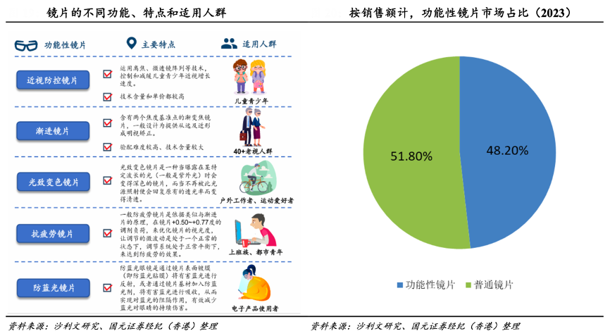 经典案例:根据沙利文研究、国元证券经纪(香港)等综合资讯表明,功能性镜片在普通镜片的基础上,通过调整材料、配方、设计或膜层,使得镜片具有近视管理、抗疲劳、防蓝光、成人渐进等功能特性,以适应不同的人群和 场合。根据沙利文研究,2023 年功能性镜片的市场占比为48.2%。目前针对不 同适用人群和使用场景发展出的功能性镜片包括:近视防控镜片、渐进镜片、 光致变色镜片、抗疲劳镜片、防蓝光镜片等。