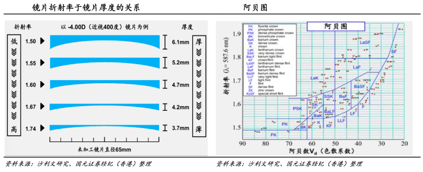 经典案例:根据沙利文研究、国元证券经纪(香港)等综合资讯表明,对于镜片而言,折射率反映了镜片对光线的折射能力,同等条件下,镜片折射率越高镜片越轻薄,越能提高佩戴者舒适度。但由于光学原因,折射率越高会 导致镜片色散系数(阿贝数)越大,进而导致镜片成像不清晰,因此在制造镜片 时,如何权衡折射率和清晰度的关系是厂商需要考虑的问题。
