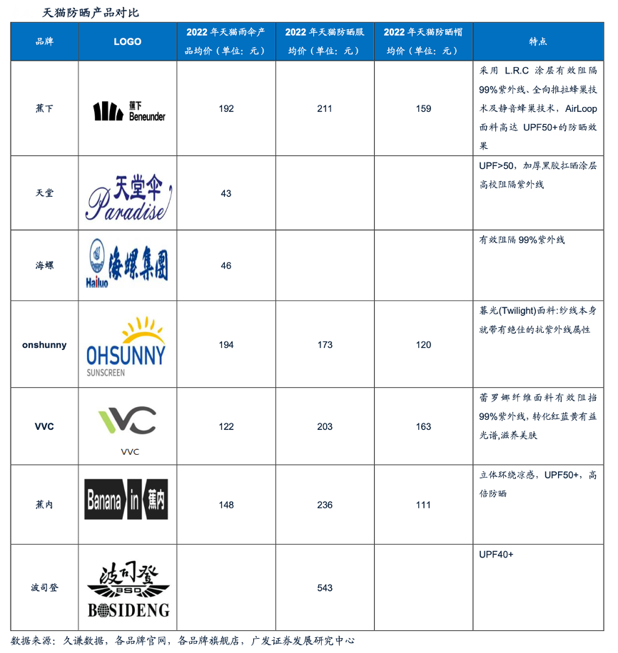 经典案例:根据久谦数据、各品牌官网、各品牌旗舰店、广发证券发展研究中心等综合资讯表明,蕉下防晒类产品定位于中高端防晒服饰避开低端市场竞争,在外观、科技和品牌方面提升产品附加值,将品牌定位于围绕年轻女性防晒需求的中高端品牌。根据久谦数据,蕉下天猫店的伞类产品均价为202元,防晒服均价为206元,防晒帽均价为160 元,均处于行业中高端价格水平。