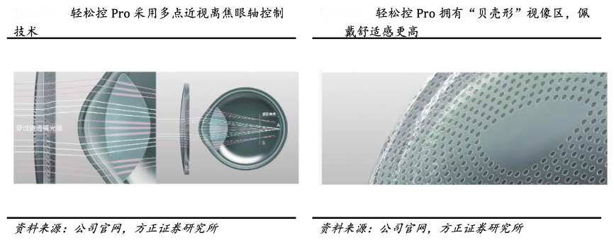 经典案例:根据公司官网、方正证券研究所等综合资讯表明,2021 年 12 月,明月镜片公司推出“轻松控Pro”,产品采用多点近视离焦眼轴控制技术,采用繁密的“满天星”微透镜排列,增加离焦面积,内部雕刻高达 1295 个正度数微透镜,使周边区域成像落在视网膜前,从而形 成膜前离焦,进而起到控制眼轴过快增长的作用。轻松控 Pro 同时还 根据中国孩子“水平视野切换多、上下视野切换少”的用眼习惯,设 计出非对称贝壳形视像区,提升佩戴舒适感。