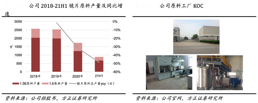 经典案例:根据公司招股书、公司官网、方正证券研究所等综合资讯表明,明月镜片公司可自主生产折射率 1.56 及 1.60 系列的树脂单体自用及对外销 售,已掌握实验室制备 1.67 及 1.71 折射率镜片相关树脂单体的配方和制备流程,考虑到 1.67 及 1.71 型号高折树脂单体的生产条件要求严格,从经济性角度选择采购而非自产。根据招股书披露,2018-21H1 公司镜片原料总产能分别为 2527 吨、2536 吨、1733 吨、890 吨。