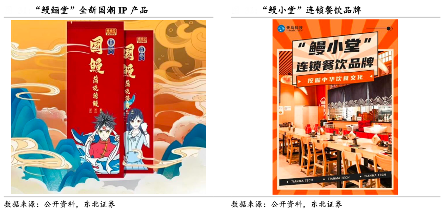 经典案例:根据公开资料、东北证券等综合资讯表明,天马科技公司自主打造了“鳗小堂”连锁品牌餐饮模式,有助于贴近终端消费者、强化公司品牌形象 以及加强终端渠道的自主管控;同时公司创造了“鳗鲡堂”全新国潮 IP,借助“国货国潮”的特征加强鳗鱼这一传统水产对 C 端年轻消费者的吸引力,产品一经登录李佳琦直播间便取得了良 好的营销效果。