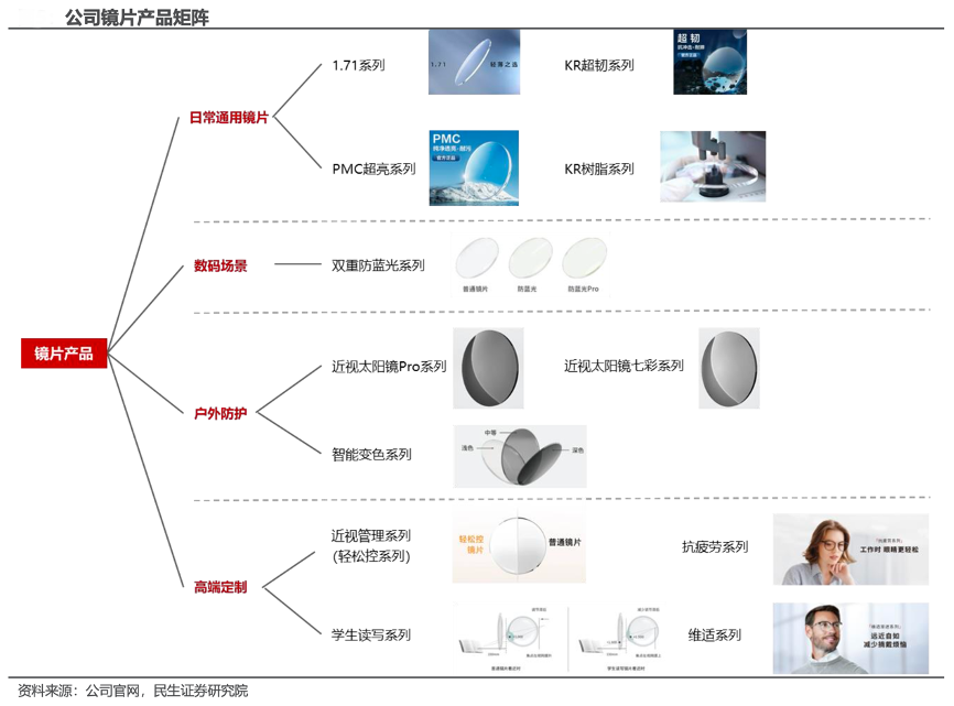 经典案例:根据公司招股书、沙利文、民生证券研究院等综合资讯表明,明月镜片公司目前镜片产品主要包含日常通用镜片和功能性镜片两大类。功能性镜片根据应用场景和人群特点不同,通过调整镜片基础材料、光学设计或镜片膜层使得镜片拥有一种或多种功能特性,目前公司功能性镜片产品包含近视管理、PMC 超亮、KR 超 韧、双重防蓝光、智能变色、偏光、渐进多焦点等。
