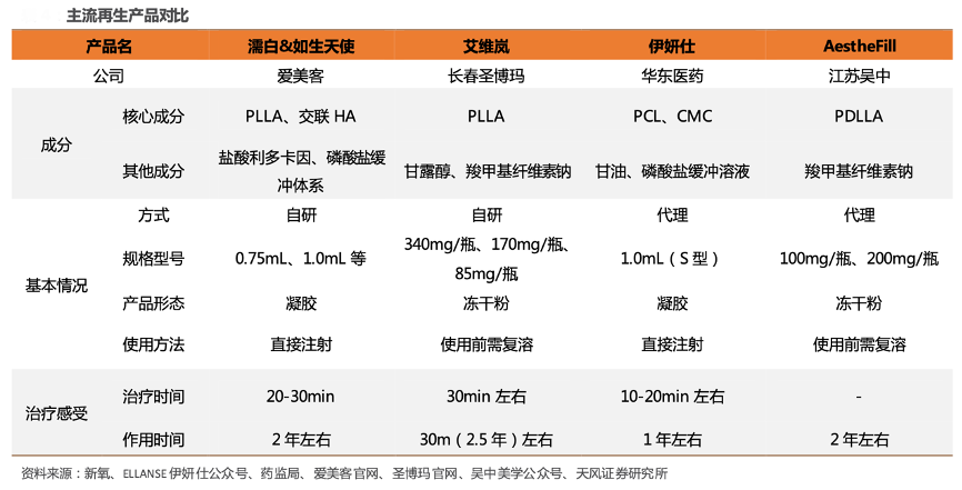 经典案例:根据新氧、ELLANSE伊妍仕公众号、药监局、爱美客官网、圣博玛官网、吴中美学公众号、天风证券研究所等综合资讯表明,与玻尿酸市场日益激烈的竞争格局相比,国 内再生市场中目前仅有 5 款产品获批,分别为长春圣博玛的“艾维岚”、华东医药的“伊 妍仕”、爱美客的“濡白天使”“如生天使”以及江苏吴中的 AestheFill。