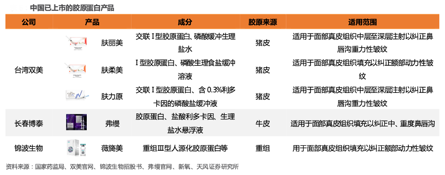 经典案例:根据国家药监局、双美官网、锦波生物招股书、弗缦官网、新氧、天风证券研究所等综合资讯表明,胶原医美应用目前仍以动物源为主导,重组胶原或可依赖技术突破加速渗透,头部厂商争相入局。此外,受胶原应用广泛性及发展前景吸引,锦波生物、巨子生物、爱美客、华熙生物、江苏吴中等国内头部厂商均加速布局胶原蛋白医美赛道。