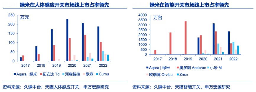 经典案例:根据久谦中台、天猫人体感应开关、天猫智能开关、申万宏源研究等综合资讯表明,绿米联创于 2014 年进入智能家居领域,专注 于低功耗创新型智能家居系统的研究与推广,2016 年推出全屋智能理念品牌 Aqara。叠加毫米波雷达,提升识别精度,人体智能感应开关、智能开关、智能套系均在天猫渠道出货量领先。2022 年 2 月,发布 Aqara 人体传感器 P1,采用 Zigbee3.0 协议和自主低功耗传感技术,在响应速度、人体移动监测、续航能力上进一步升级。