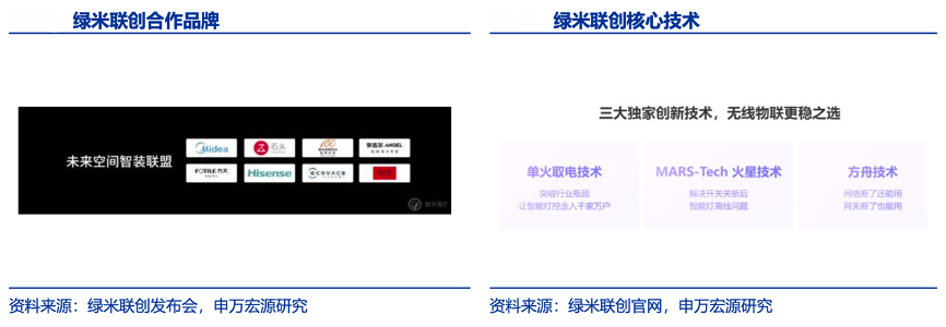 经典案例:根据绿米联创发布会、绿米联创官网、申万宏源研究等综合资讯表明,三大核心技术加持,绿米用户体验稳定为先。单火取电技术解决了传统家庭单火线,智能 化改造困难的痛点,不换灯就可实现智能灯控;Mars-Tech 火星技术(多负载类型强适应高 可靠开关技术)解决了开关关断后智能灯离线问题。