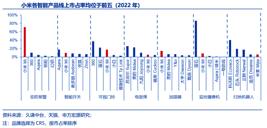 经典案例:根据小米商城、申万宏源研究等综合资讯表明,结合IDC 智能家居数据,2022Q1 小米智能家居出货量市场份额达到 18%,远超其他企业。截至 2022 年 12 月,小米共投资 420 家企业,绿米、云米、石头科技等均为具有代表性的智能家居生态链企业;AIoT 连接设备数达到 5.89 亿,同比 +35.8%,米家 APP 的月活跃用户数同比+18.6%至 7580 万,在我国乃至全球市场均处于 领先地位。