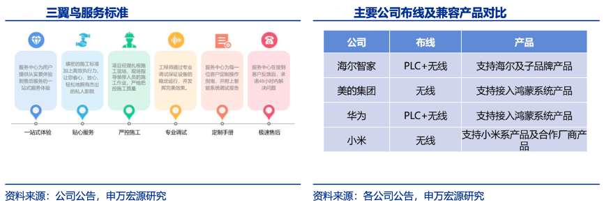 经典案例:根据公司公告、各公司公告、申万宏源研究等综合资讯表明,海尔智家在连接与产品端具有显著优势,采用场景与功能引领的模式,对已有的高市占率大电进行智能功能升级,并发力场景连接。