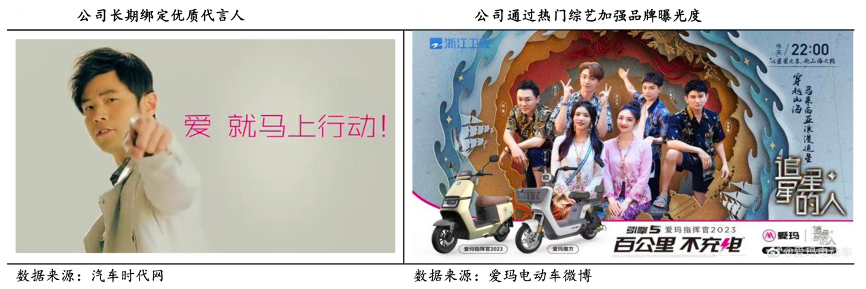 经典案例:根据汽车时代网、爱玛电动车微博、国泰君安证券研究等综合资讯表明,爱玛自 2009 年起深度绑定周杰伦作为品牌代言人,彰显公司品质如一的可 靠形象。同时,爱玛自 2021 年起开启多样化广告投放,在线下全方位渗透消费者的出行场景,包括高铁广告、社区广告以及地铁广告等,2023 年通过携手《披荆斩棘 3》、《乘风 2023》、《青春飞一般》、《追星星的人》等顶流综艺,实现“产品露出+明星效应+品牌价值+销 量转化”的全维共赢。