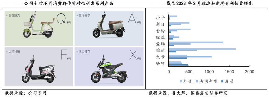 经典案例:根据公司官网、鲁大师、国泰君安证券研究等综合资讯表明,爱玛将旗下产品氛围四个系列,并精准定位相应客群,减少了比较成本,加大转化率,例如 Q 系列针对女性群体,强调小巧精致的外观和明亮时尚的配色;A 系列定位生活美学,面向大众群体推进产品普适化。