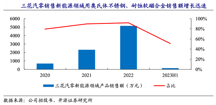 经典案例:根据公司招股书、开源证券研究所等综合资讯表明,与金则利形成合作的氢能源领域优质客户已有三家。其不断开拓新能源领域 的优质客户,对重要客户三花汽零销售的新能源领域用奥氏体不锈钢、耐蚀软磁合 金产品的销售额分别为 692.04 万元、2,322.70 万元、5,150.01 万元和 148.81 万元, 占新能源领域收入的比例分别为 79.38%、89.62%、91.81%和 51.00%。