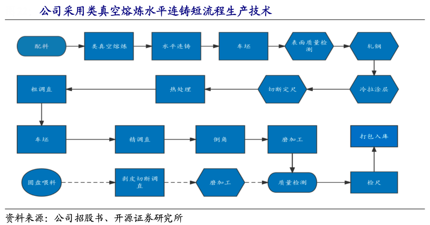 经典案例:根据公司招股书、开源证券研究所等综合资讯表明,金则利的核心产品通过采用类真空熔炼水平连铸短流程生产技术,替代了传统 的真空熔炼方法,该生产工艺技术为国内首创。其解决了钢液二次氧化及铸坯组织不均、致密度低等问题,同时优化产品成分形成了小断面连铸耐蚀软磁合金棒材技术,打破了我国高端电磁阀用耐蚀软磁合金大部分依赖进口的局面。