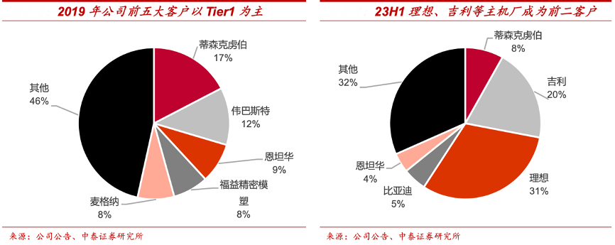 经典案例:根据公司公告、中泰证券研究所等综合资讯表明,博俊科技公司重庆工厂拥有众多整车厂客户:长安、吉利、理想、赛力斯等,自 2021 年重庆工厂投产后,相关客户配套车型陆续投入量产,客户结构发生显著变化,2019 年公司前五大客户都是 Tier1,2023 年上半年理想、吉利收入占比 分别达到 31%、20%,成为前二大客户。