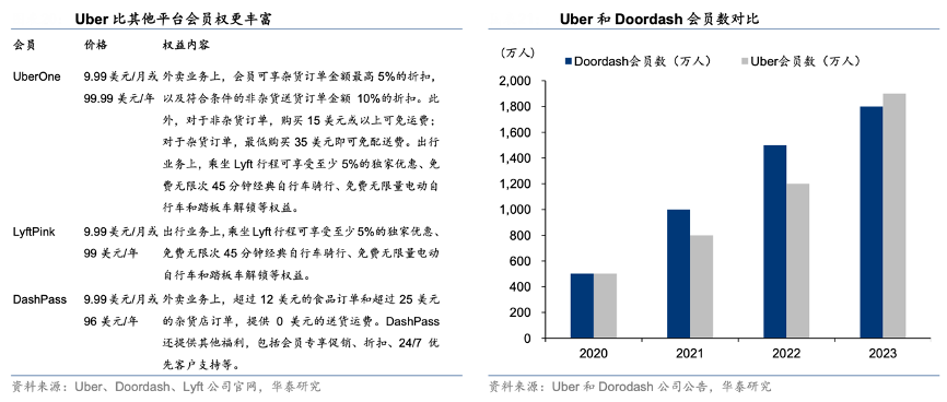 经典案例:根据Uber、Doordash、Lyft公司官网、Uber和Doordash公司公告、华泰研究等综合资讯表明,Uber 以会员制进行业 务间的深度绑定,在同样的价格下权益内容比其他单一平台更为丰富,通过提供包括网约车和外卖在内的多项服务优惠(例如在外卖业务上会员可以享受订单金额最高 5%的折扣;根据 Uber2023 投资者日,Uber 会员用户的消费是非会员用户的 3.4 倍。