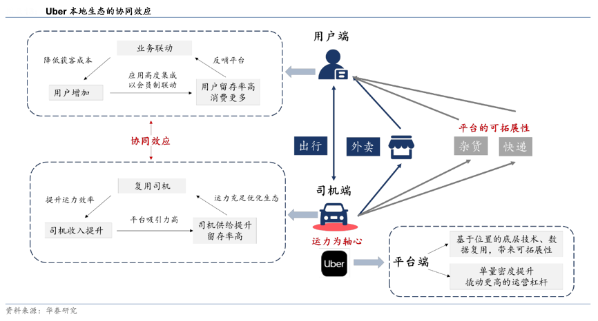 经典案例:根据华泰研究等综合资讯表明,相比于其竞争对手 Doordash(外卖)和 Lyft(出行)等仅从事一项业务,Uber 以移动运力网络的复用为基础,将外卖和出行业务整合,在司机端、用户端和平台端均带来了更强的协同效应。